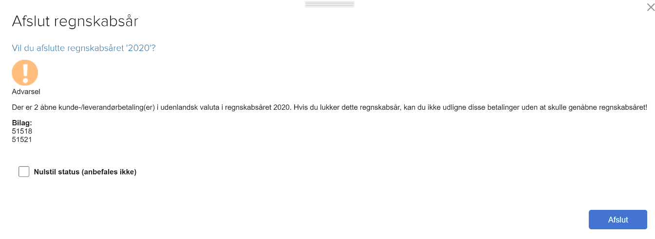 Hvis der er en betaling i en udenlandsk valuta, som ikke er udlignet, vil der komme en besked med en advarsel, når du prøver at afslutte regnskabsåret.