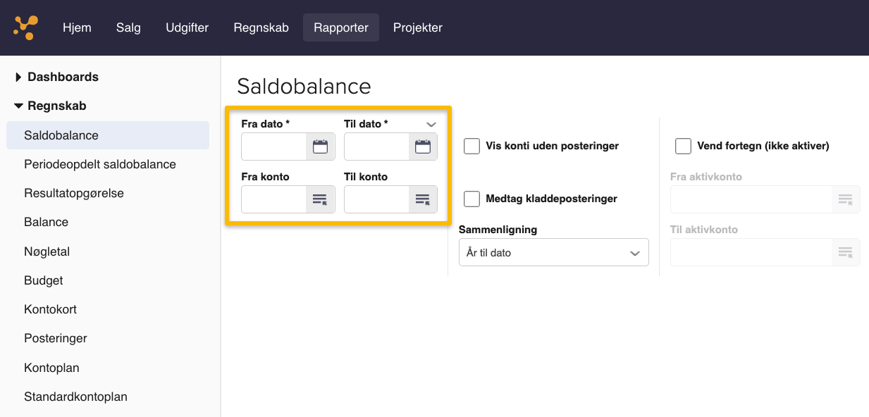 - Indtast perioden du vil afstemme fra i felterne "Fra dato" og "Til dato".