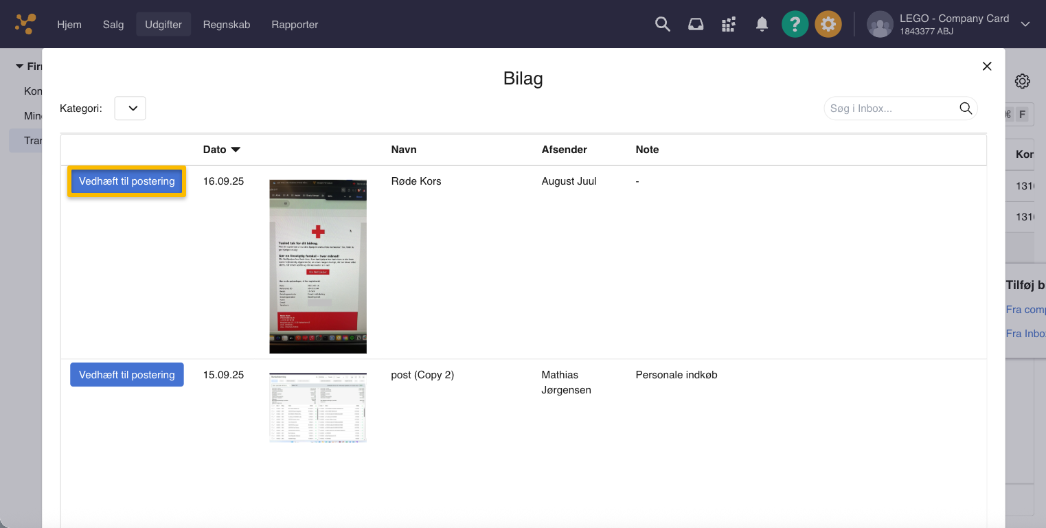 - Dette åbner en liste med transaktioner lavet med dit Firmakort. Tryk på den transaktion, du ønsker at tilføje et bilag til.