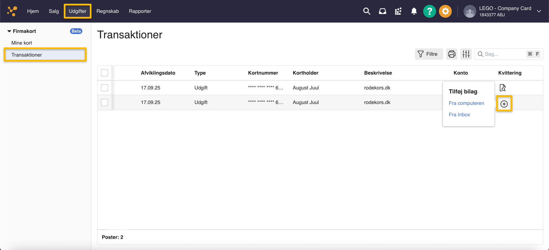 Denne guide beskriver, hvordan Normal- og Udgiftsbrugere kan tilføje bilag til transaktioner foretaget med Firmakort.