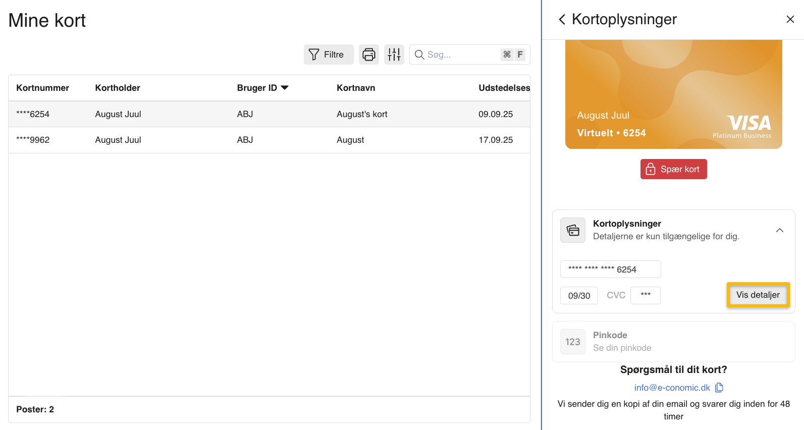 Kortet oprettes med en pinkode, som ikke kan ændres. Af sikkerhedshensyn kan kun kortholderen se sin egen kode, og du skal logge ind med MitID eller Face ID.