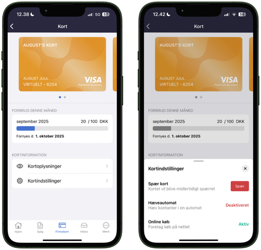 Begge brugertyper kan håndtere deres eget Firmakort både på hjemmesiden og i mobilappen. Dette inkluderer et overblik over forbrug i indeværende måned, kortoplysninger samt kortindstillinger.