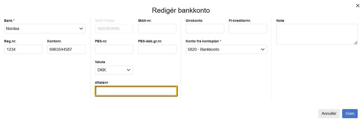 - Hvis du har "Nordea Business" skal du udfylde feltet "Aftalenr." med dit online aftalenummer efterfulgt af "|" og herefter dit online aftalenummer igen - altså "online aftalenummer|online aftalenummer" skal indsættes her.