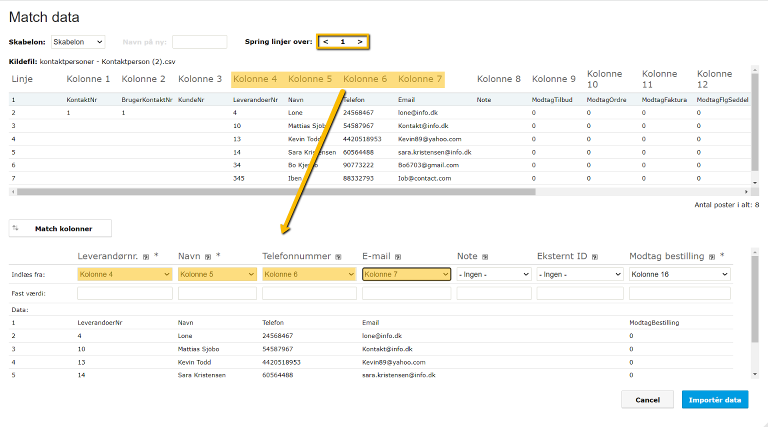 - Tryk på "Åbn" og på "Indlæs fil". Herefter skal du matche kolonnerne i din kildefil med indlæsningen.