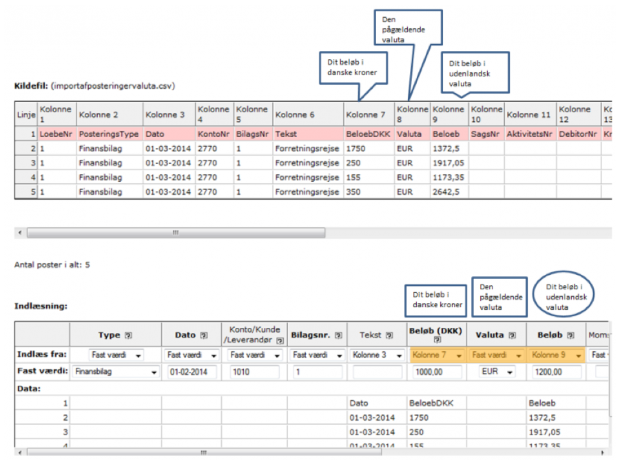 Beløb (DKK): Når du skal importere posteringer i udenlandsk valuta, skal du have kolonner med både udenlandsk og indenlandsk valuta.