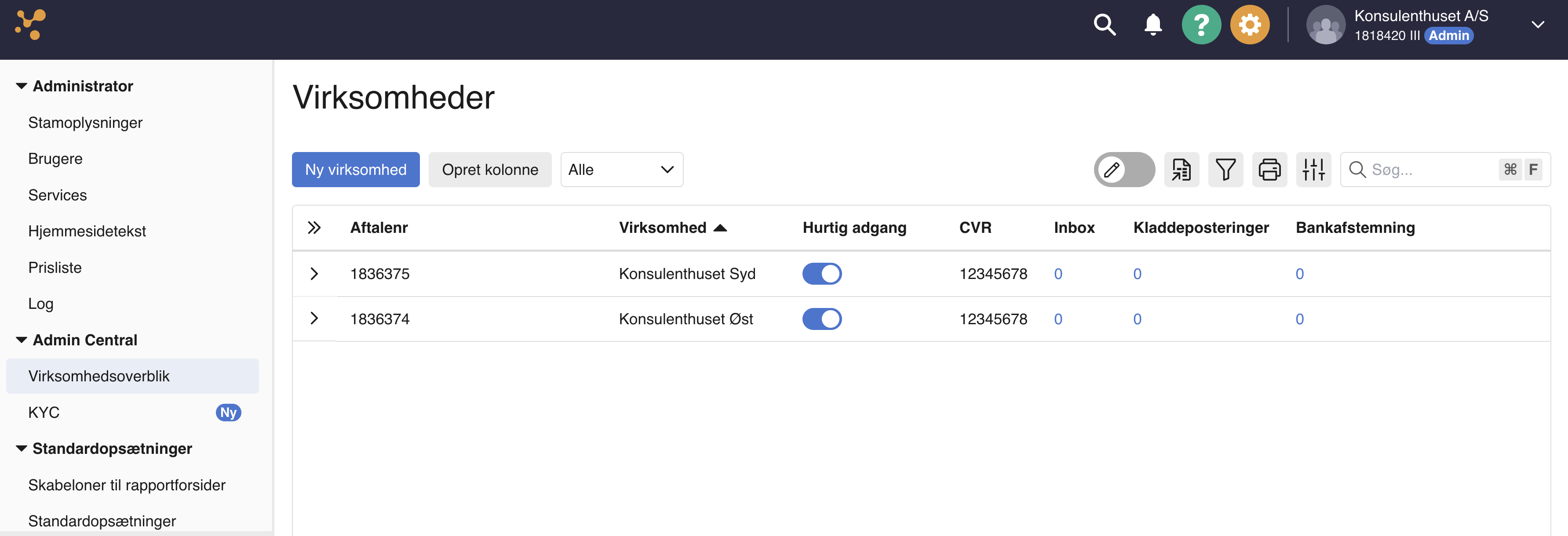 Med koncernadgang får du ikke kun en samlet adgang til dine regnskaber - du får også adgang til en række særlige funktioner og værktøjer, der er specifikt udviklet til at lette den daglige administration af flere regnskaber. Dette sparer dig for besværet med at skulle huske og administrere separate loginoplysninger for hver enkelt aftale, samtidig med at det giver dig et bedre overblik over alle dine tilknyttede virksomheder. Når du logger ind vil du kunne se dit virksomhedsoverblik som kan ses for neden.