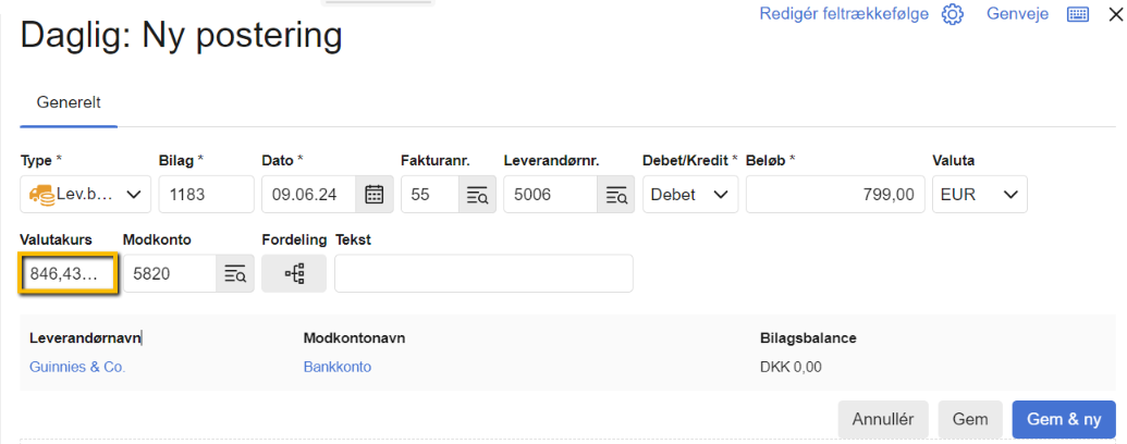 Du kan altid udregne valutakursen på dit bogførte bilag ved at dividere "Beløb (DKK)" med "Beløb (Val)" og gange med 100 for at se, hvorvidt det er den ønskede kurs som er brugt.