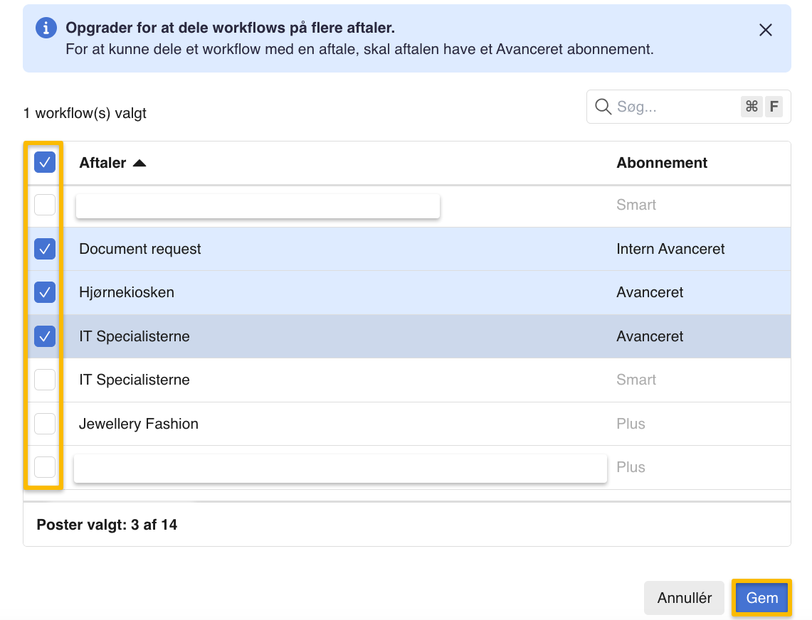 - Delte workflows er kun tilgængelig for aftaler der ligger i avanceret-pakken.