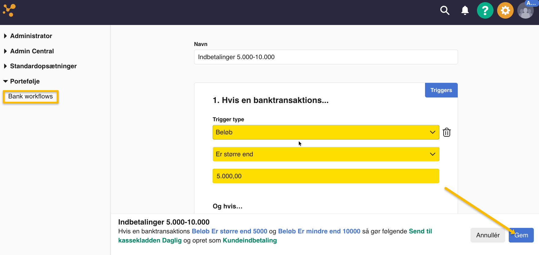 Det er på nuværende tidspunkt kun muligt at oprette bank-workflows med triggertyperne "Tekst" og "Beløb".