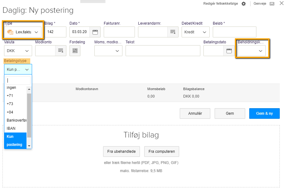 Når typen ”Kun postering” vælges, ændres feltet ”Forfaldsdato” til ”Betalingsdato” og et nyt felt ”Beholdningskonto” dukker op.