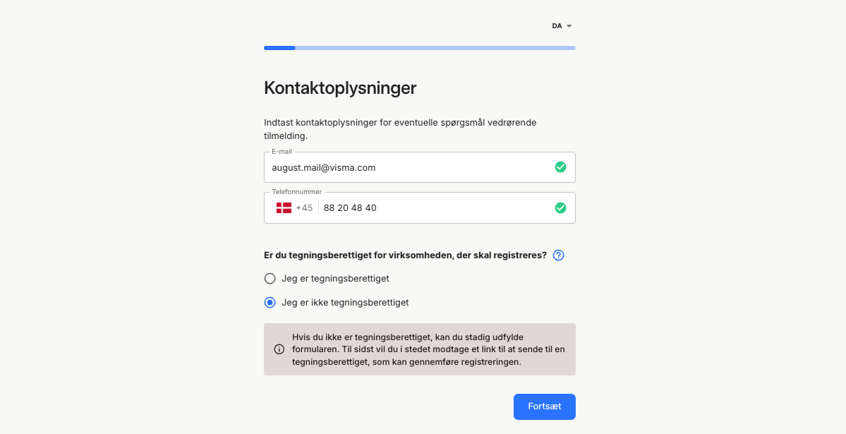 - Kontrollér, at oplysningerne CVR-nummer og firmanavn er korrekte, og indtast land. Informationen er hentet fra dine stamoplysninger, så hvis de ikke er korrekte, skal du redigere dem der.