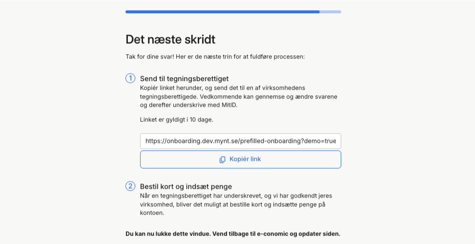 - Afslutningsvis skal du kopiere linket set på skærmen, og sende det til de tegningsberettigede så de kan underskrive med MitID.
