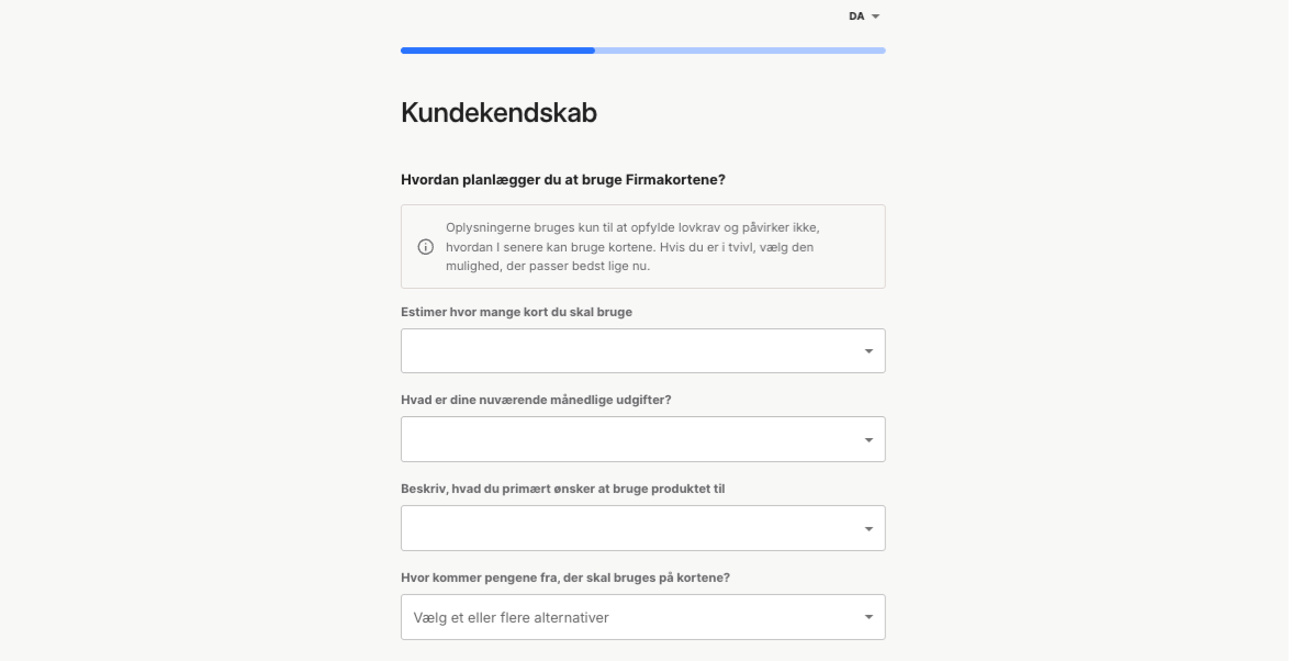 - Angiv et estimat for hvor mange Firmakort du vil få brug for, og bagefter et estimat på dine nuværende månedlige udgifter.