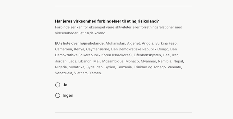 - Svar "Ja" eller "Nej" til om virksomheden har forbindelse til nogle høj-risiko lande.