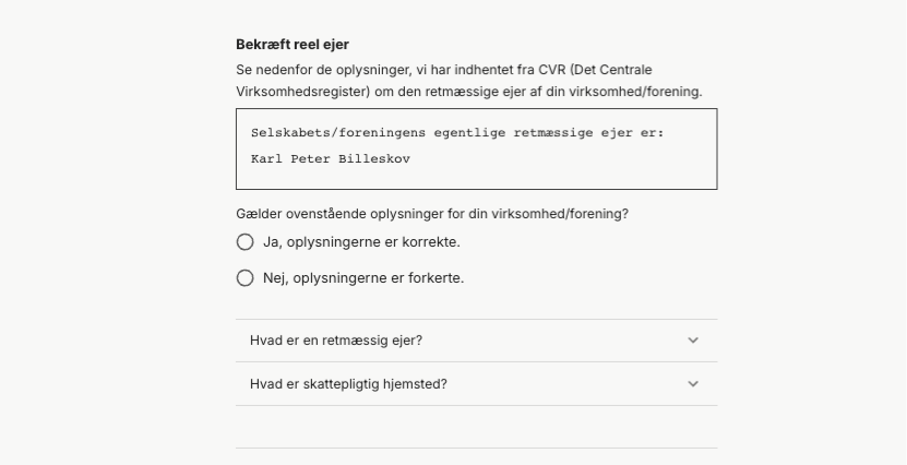 - Svar "Ja" eller "Nej" til om de oplysninger Mynt har indhentet fra CVR om den retmæssige ejer af virksomhed/foreningen er korrekt.