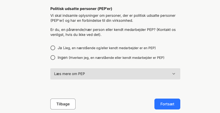 - Som sidste del af KYC-ansøgningen skal du angive om virksomheden har nogen politisk eksponerede personer (PEP), hvorefter du skal trykke på den blå knap "Næste".