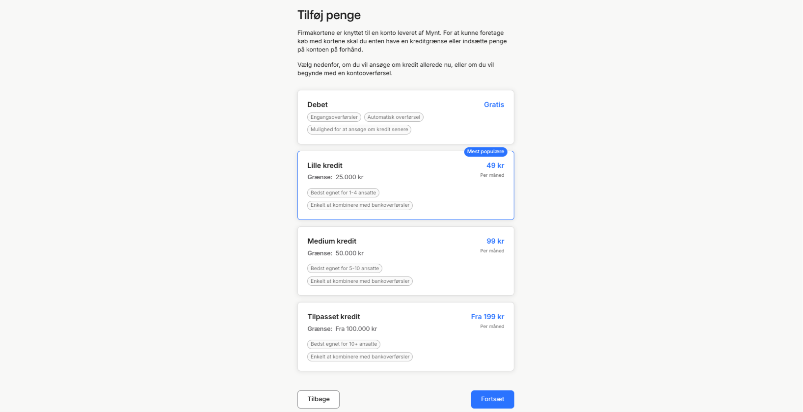 - Nu er Firmakort aktiveret, men for at gennemføre opsætningen skal du trykke på "Forsæt til Mynt".