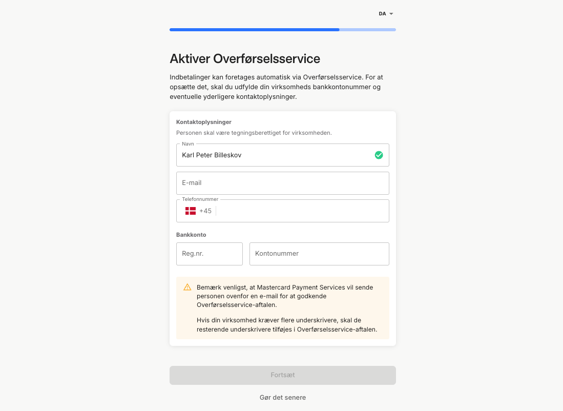 - (Valgfrit) Aktiver Overførselsservice hvis du ønsker indbetalinger kan foretages automatisk, ved at indtaste bank- og tegningsberettigede informationer.