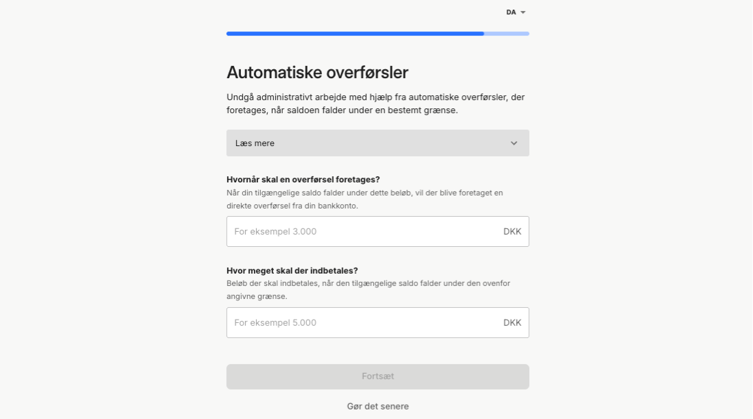 - Vælg om du vil ansøge om kredit allerede nu, eller om du vil begynde med en kontooverførsel. Tryk efterfølgende på “Forsæt”.