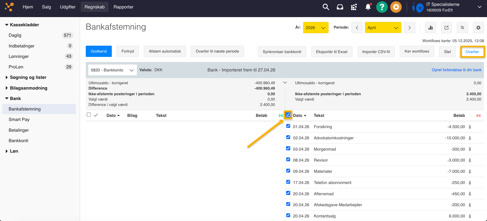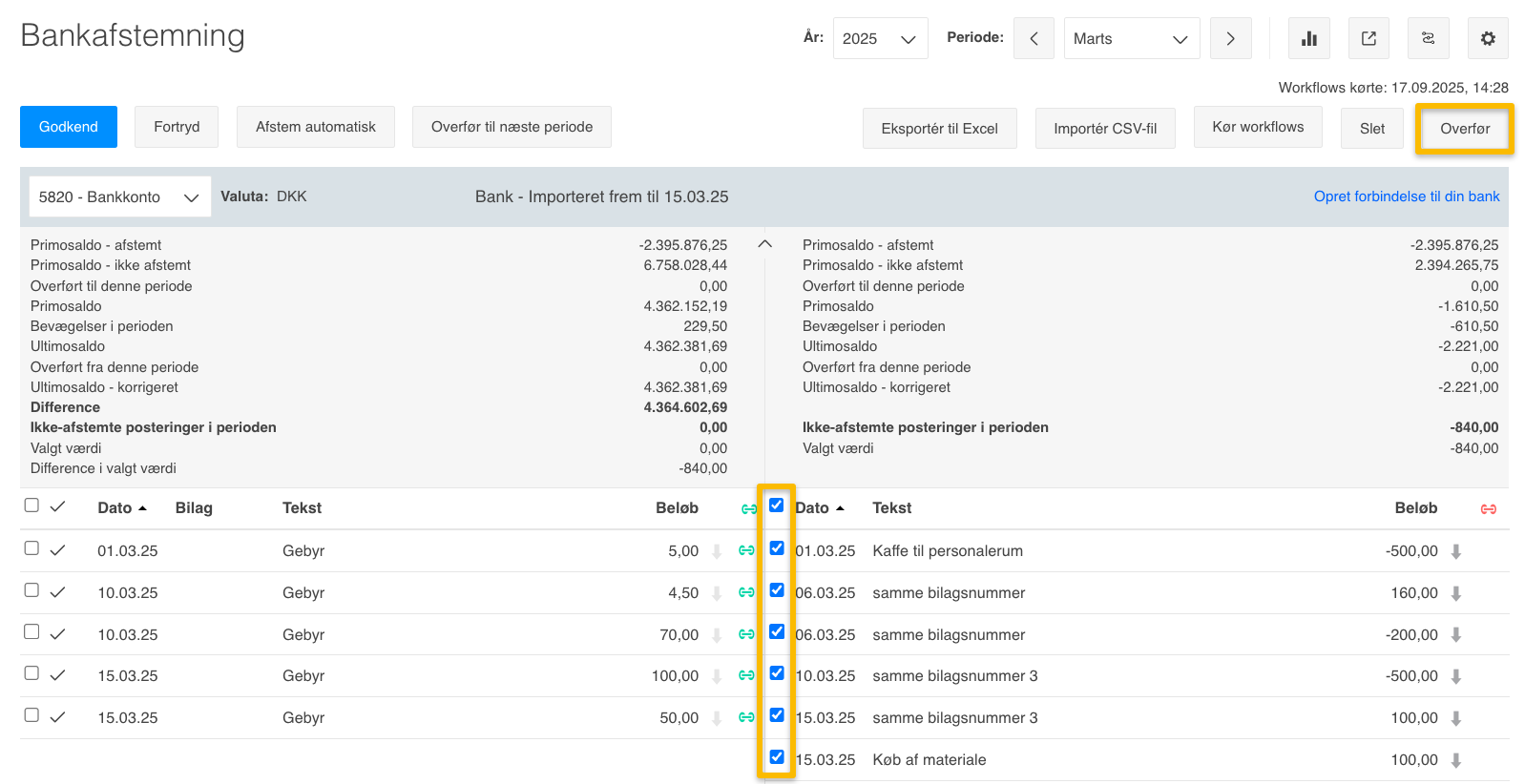 - Markér de posteringer med flueben, som du vil have med over i din kassekladde, i højre side af bankafstemningen.