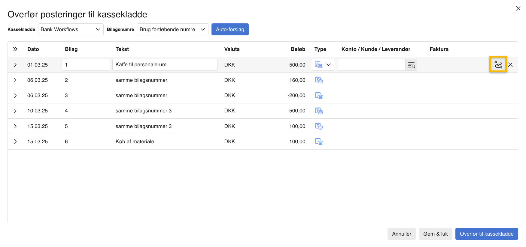 Overfør til kassekladde |