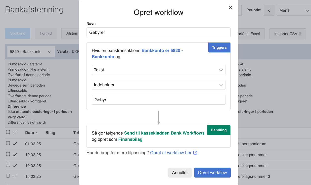 Du kan oprette et bank-workflow direkte fra Overfør-vinduet, mens du arbejder med dine bankposter. Funktionen er ideel, når du møder en betaling, du fremover vil automatisere.