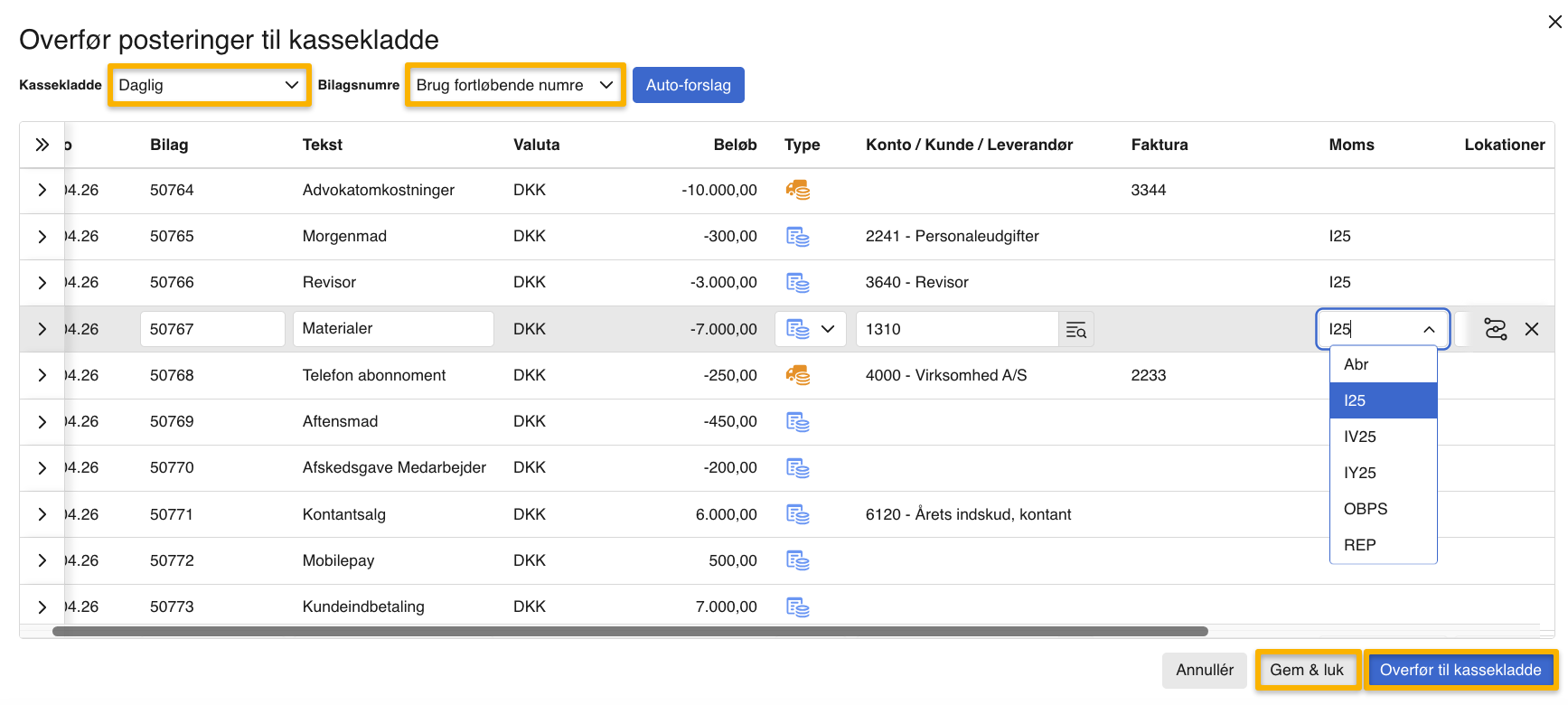 - Tryk på "Overfør til kassekladde".