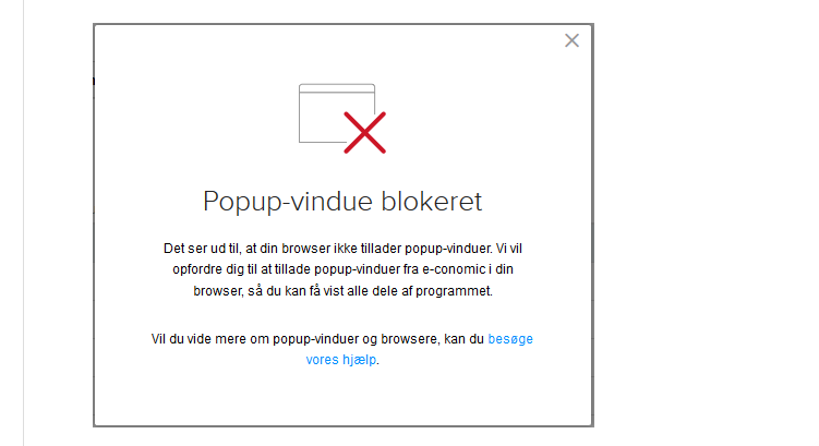 Der er mange browsere, som ikke tillader pop op-vinduer. De er indstillet, så du undgår reklamer og lignende. Men for at kunne bruge e-conomic optimalt, skal du sikre dig, at din browser tillader, at der vises pop op-vinduer fra e-conomic.